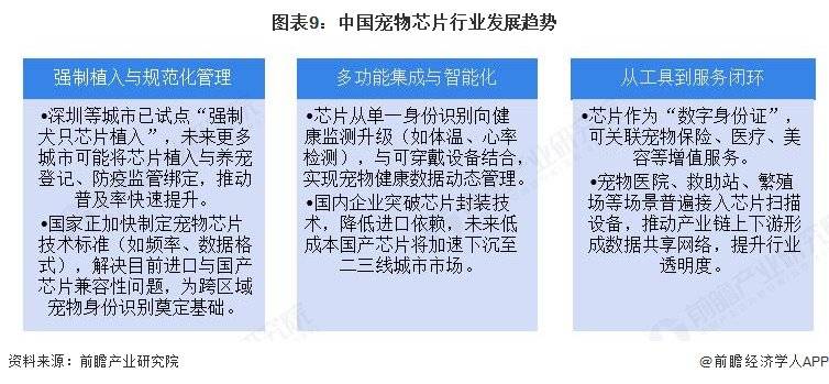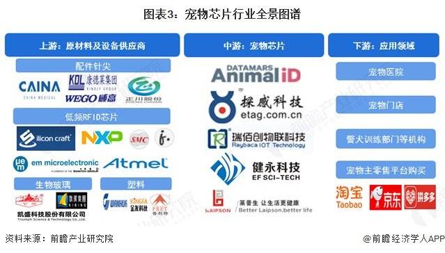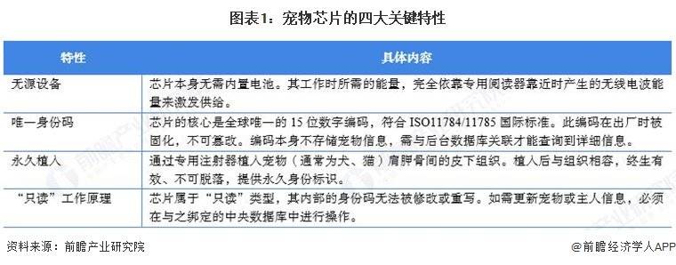 更多本行业研究阐发详见前瞻财产研究院《中国宠物行业(宠物经济)市场前景预测取投资计谋规划阐发演讲》宠物芯片行业财产链上逛为焦点原材料取高端设备供应商,宠物芯片具备无源设备、独一身份码、永世植入和“只读”工做道理四大环节特征。